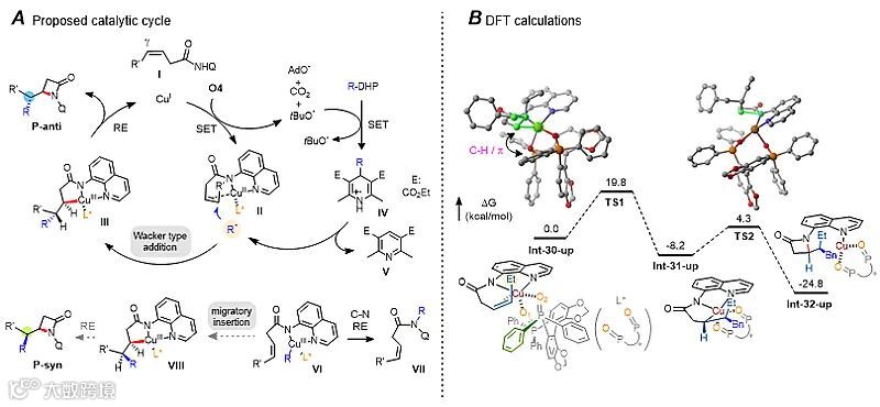 基于实验结果和已有的文献报道,作者提出了一个可能的自由基介导机理(图4A)。首先,Cu(I)与氧化剂O4发生单电子氧化反应,得到叔丁氧基自由基和Cu(II),随后与烯烃底物和配体生成中间体II;然后,叔丁氧基自由基与R-DHP反应得到亲核性的烷基自由基R•、吡啶V和叔丁氧基负离子;接着,烷基自由基R•对中间体II在烯烃γ-位进行亲核进攻(Wacker type),形成五元环Cu(III)中间体III;最后,中间体III发生分子内的C-N还原消除得到β-内酰胺化合物P-anti。烷基自由基R•也能转移到Cu(II)上得到烷基-Cu(III)中间体VI,随后发生还原消除得到N-烷基化副产物VII。作为可替代的路径,中间体VI的R基团也可以经历对双键的迁移插入过程得到β-内酰胺产物P-syn。经过对产物3的绝对构型进行分析,作者推测该反应经由亲核加成途径进行。