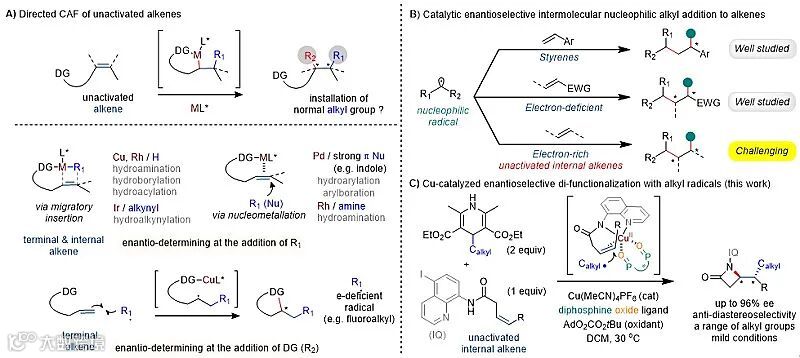 烯烃不对称官能团化反应可以高效、快速构建手性化合物,在有机合成化学中一直受到广泛关注。目前,活泼烯烃的不对称官能团化反应得到了极大的发展,相比之下非活化烯烃分子间不对称官能团化反应还有很大的局限性,仍然极具挑战。近年来,化学家们通过底物导向策略解决了许多难题(区域选择性、反应活性等),实现了一系列过渡金属催化非活化烯烃不对称官能团化反应(图1A)。多种导向基团被应用于促进R1基团对双键的对映选择性加成反应,形成烷基金属中间体,进而发生后续官能团化或质子化得到手性化合物。最近,铜催化的自由基反应已经成为非活化端烯不对称双官能团化的一种新的途径。然而,这类反应常常需要使用缺电子的烷基自由基前体(例如•CF3)首先对端烯非立体选择性的加成启动,得到苄基自由基,然后在金属与配体作用下被导向基团立体选择性捕获得到手性产物。普通的烷基自由基由于具有一定的亲核性,与富电子的非活化内烯烃电性不匹配,在该策略下很难实现相应的转化(图1B)。因此,截至目前,非活化烯烃不对称碳官能团化反应仅限于芳基、酰基、炔基和缺电子烷基的引入,普通烷基自由基对非活化烯烃的不对称加成反应仍然具有很大的挑战性。