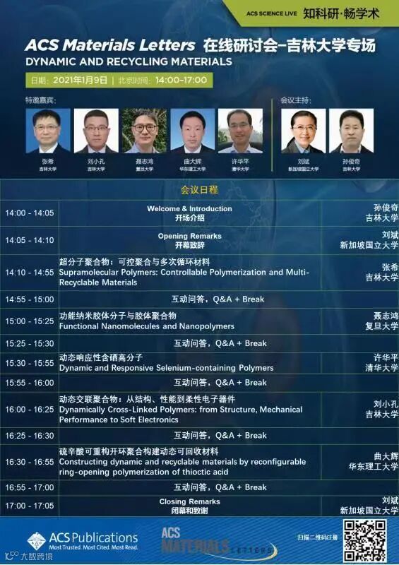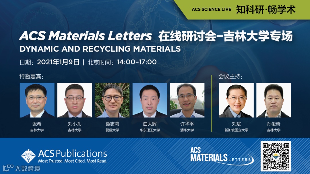 为诚挚感谢ACS Materials Letters的作者、读者和审稿人并与其进行深入交流,执行主编刘斌教授携其编辑团队将在2021年开启走进中国高校和研究所的系列研讨会活动。首站研讨会与吉林大学超分子结构与材料国家重点实验室共同举办,聚焦“Dynamic and Recycling Materials”。此次大会主席为刘斌教授和孙俊奇教授,特别邀请了吉林大学校长张希院士,以及聂志鸿教授、许华平教授、刘小孔教授和曲大辉教授,与大家分享他们的最新成果和科研心得。