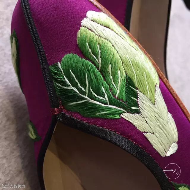 Denise设计的鞋面图案和传统图案不太一样。除了经典的刺绣图样,她还设计了公鸡、蔬菜等“怪异”的图案。她的创作灵感来自任何时间、任何地方,“有人用音乐或文字来表达自己的感受,而我常常借我的设计来表达我关注的东西”。