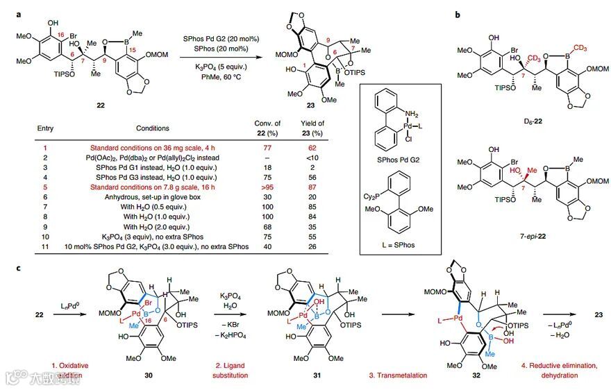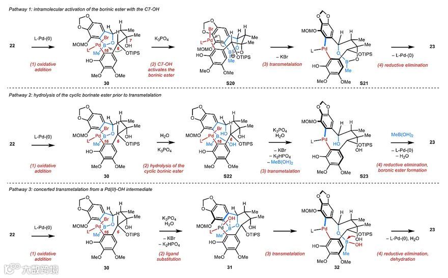 经过大量的条件摸索(图4a),作者发现使用20 mol % Buchwald发展的Sphos-Pd-G2催化剂、20 mol % SPhos、5当量K3PO4在甲苯中于60 ℃下反应,能以87%的分离收率得到6 g单一的非对映异构体6。随后,作者对该偶联反应进行了深入的解析。因为中间体32(钯杂九元环)是刚性的结构,作者推测它不会发生明显的阻转异构化,所以决定立体构型的过程就是转金属化过程。起初作者认为C7位的羟基活化了硼酸酯(图5,Pathway 1),但是却得到了几何上不利于这种相互作用的7-epi-22,这说明其他因素在起作用。值得一提的是,在条件优化过程中,作者发现少量的水是反应成功的关键,然而2当量的水又会抑制反应。一开始作者怀疑水可能导致环状硼酸酯水解成非环状硼酸酯(图5,Pathway 2),但是D6-22的交叉实验推翻了这一假设,这是因为在反应过程中B一直在同一分子中,不会发生交换。最后,作者参考了Denmark和Hartwig的工作,认为Suzuki偶联反应中的转金属化发生在芳基-Pd(II)-OH物种和中性硼酸酯之间(图5,Pathway 3)。