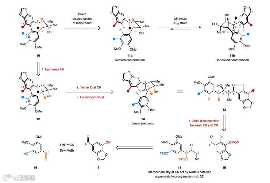 首先,来介绍一下逆合成路线:化合物10可以从化合物11a和11b出发,并且在联芳基偶联前,预先在化合物11a/11b的C6、C7、C9位引入氧化态。然而,化合物10中C6和C9位的酯基处于假直立式,碍于位阻效应,芳基-芳基偶联会受到排斥。事实上,由于烯丙基张力作用,与最终化合物10匹配的构象异构体11a占少数,而不期望的构象11b占主导。所以,作者对逆合成路线做了两项调整。第一,翻转C6位的构型(化合物12 vs. 10);第二,将C9位的羟基和C15位的转金属化基团连在一起(化合物13),该设计既能消除烯丙基张力,又利于立体专一性偶联。其中化合物13可以通过酮14和醛15发生aldol反应得到,而酮14和醛15又可以由化合物16和17制备而来。