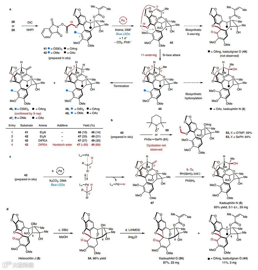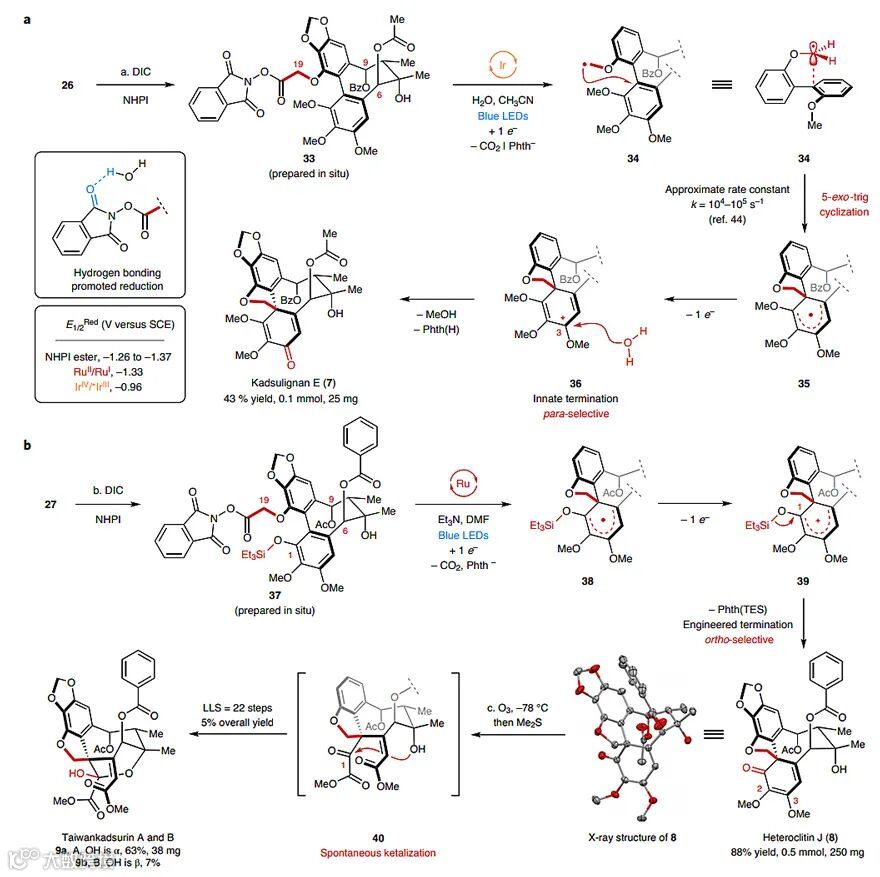 接下来便是本文的重中之重了—如何利用自由基化学实现阶段3型DBCOD分子的合成。为此,作者从Kadsulignan E (7) 和heteroclitin J (8)着手(图6)。作者推测底物33中的NHPI基团在氢键作用下会经历单电子还原得到中间体34,随后经5-exo-trig环化促使中间体35的生成。后者发生单电子氧化,得到戊二烯正离子36,其C3位接受水的加成后,再伴随一分子甲醇的离去,便会得到化合物Kadsulignan E(7)。幸运的是,采用Glorius团队的反应条件:2 mol % [Ir(ppy)2(dtbpy)(PF6)]、100当量水,在蓝光照射下,化合物33能顺利发生反应,最后以43%的分离收率得到单一的异构体7,它含有对位螺环二烯酮结构,相反,化合物8中的螺环二烯酮处于邻位。针对这一差别,作者的应对策略是在化合物37的C1位引入硅醚基团,当C19位自由基发生5-exo-trig环化得到中间体38,再经历单电子氧化生成中间体39后,C1位上羟基连的TES会离去,随之生成heteroclitin J (8)。这里作者采用的是Overman团队的合成条件:1 mol % Ru(bpy)3(PF6)2和2当量Et3N,由于Et3N可以直接将激发态的Ru(II)物种还原成Ru(I),这份还原电势足够对NHPI基团进行单电子还原,不需额外的氢键作用,所以反应体系应保持无水。最后以88%的收率制备了250 mg heteroclitin J (8)。另外,Taiwankadsurin A和B是从菲律宾南五味子中分离得到的天然产物,目前有关其生源合成暂不清楚。为此,作者从化合物8出发,利用臭氧断裂C2和C3间的碳碳双键,得到的中间体40自发关环形成半缩酮9a和9b,最后以70%的总收率、9:1的d.r.值得到Taiwankadsurin A和B。