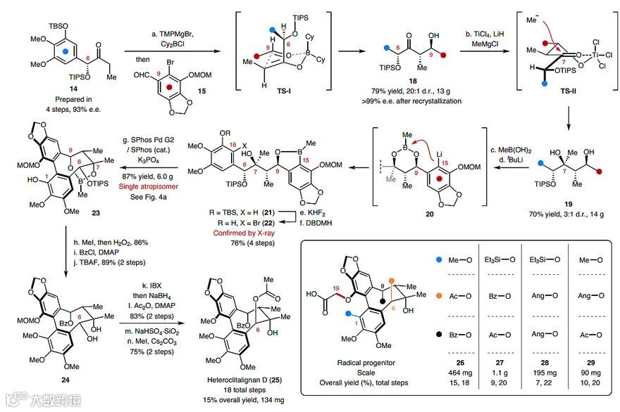 于是,作者提出了如下催化路径(图4c)。底物22经氧化加成得到中间体30;催化量的水在碱的作用下与Br负离子发生配体交换,形成中间体31。而过量的水会导致硼酸酯的水解,所以反应效果差。中间体经四元环过渡态进行转金属化,并在此过程中将底物22中C6和C9位的点手性传递到产物23的轴手性。作者利用11步反应,实现了化合物23的克级制备,后者经过几步官能团调整:C1位羟基上甲基,利用H2O2脱除硼酸酯,随后对C9位羟基进行Bz保护,再脱除C6位TIPS保护基,利用RanjanBabu发展的氧化还原连续反应,对C6位的手性构型进行翻转。最后,对C6位羟基上Ac保护基,并脱除MOM保护基再对该酚羟基上甲基。至此,作者以18步反应、15%的总收率得到了>100 mg的 Heteroclitalignan(25)。从化合物23出发,作者还分别实现了其他非天然类似物(26-29)的合成,且最大规模可达到克级。