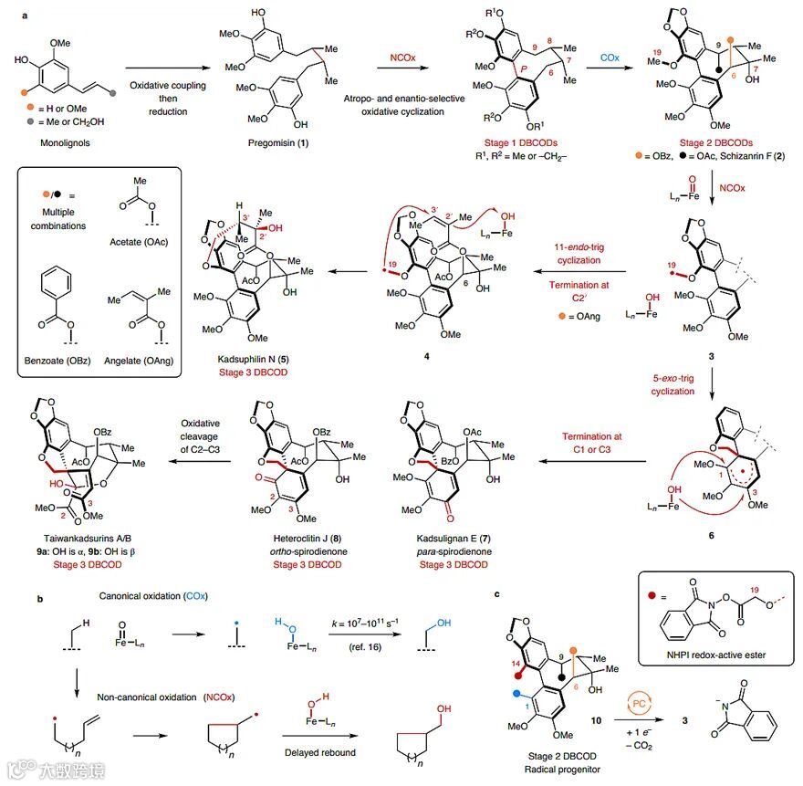五味子是一类非常有价值的药用植物,其中一个重要成分是木脂素,它具有鲜明的结构特征:即含有一个高度氧化的联苯环辛二烯骨架(DBCOD)。然而,目前针对DBCOD型木脂素的生物合成研究相对有限,一条假设的生源合成路径如下所示(图1a):木质素经过氧化偶联和还原后,生成pregomisin (1);后者经对映选择性氧化环化后形成这个家族分子中特色的DBCOD结构。归为阶段1型DBCOD分子的特征是:脂肪链上的C6和C9饱和,C7和C8的构型分别是S和R,并且拥有联芳基轴手性。该阶段分子再度氧化后,在C7位引入三级醇,并在C6和C9位安装OAc、OBz或OAng基团,便得到了阶段2型DBCOD分子,如Schizanrin F (2)。接着,将C19位的甲基进行C-H键氧化后,生成的自由基既可以发生5-exo环化,也可以进行11-endo自由基环化,从而促使了氧化程度最高、结构最为复杂的阶段3型DBCOD分子的生成。Kadsuphilin N (5)、Kadsulignan E (7)、Heteroclitin J (8)以及Taiwankadsurin A/B (9a & 9b)都属于该阶段的分子。事实上,在生物体内细胞色素P450或非血红素氧化酶参与的氧化反应通常以两种途径(“经典”氧化和“非经典”氧化)进行,两者的区别在于底物中的自由基是否先异构化,再与Fe(III)-OH结合。若不经异构化,则称为“经典”氧化;反之,则是“非经典”氧化(图1b)。而DBCOD型木脂素从阶段2到阶段3,就需要利用“非经典”氧化反应。