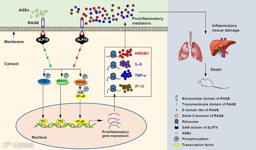 体外(in vitro)和体内(in vivo)实验证实SLP76蛋白SAM结构域通过与RAGE胞浆内段羧基末端结合介导RAGE下游信号传递。细胞学实验证实RAGE活化可通过募集细胞内接头蛋白SLP76,介导下游信号分子p38 MAPK、ERK1/2和IKKα/β的磷酸化激活,从而导致促炎因子的释放(图2)。进一步使用基因敲除技术证实,AGER(编码RAGE蛋白)或SLP76基因缺失可显著抑制晚期糖基化终末产物(AGEs)诱导的p38 MAPK、ERK1/2和IKKα/β磷酸化,从而减少促炎细胞因子的释放。