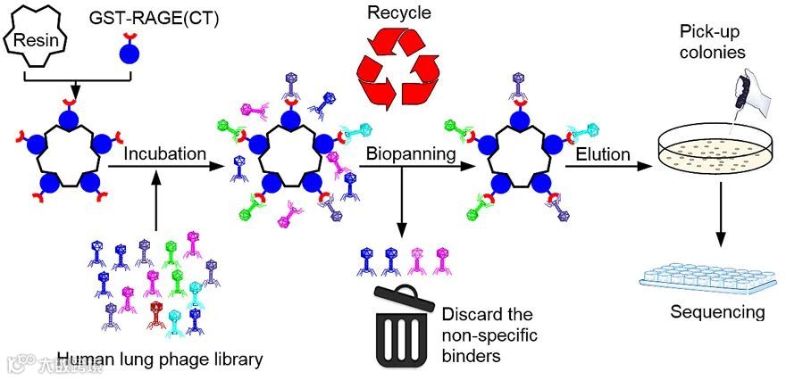 尽管RAGE在脓毒症过程中具有重要作用已获得共识,但其胞浆内段所介导的近膜分子事件及其如何活化下游信号激酶级联传递过程尚不清楚。该研究使用T7噬菌体展示技术(图1)筛选到RAGE胞浆内段作用蛋白SLP76。