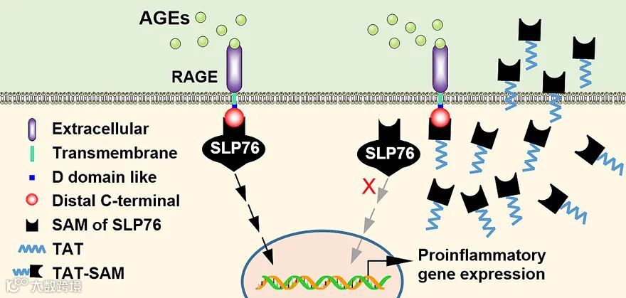 综上所述,该研究探索了靶向RAGE胞浆内段的融合蛋白TAT-SAM干预RAGE介导的细胞内信号过程作为治疗脓毒症的新策略,为临床靶向治疗脓毒症提供了新的线索和思路。