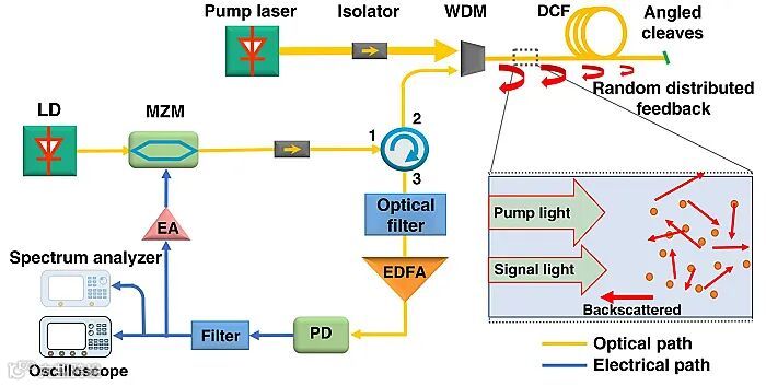 近年来针对光电振荡器的研究有了许多的进展,包括耦合OEO、多环路OEO、注入锁定OEO、傅里叶域锁模OEO、宇称时间对称OEO等等。从本质上讲,传统的OEO基于闭合的光电腔,其频率振荡范围非常有限,其中心是一组离散的腔模,振荡频率由固定的腔长来确定。传统光电振荡器的器件一旦确定后,其环路构成了闭合的谐振腔,环腔长度决定了环腔中能够从噪声起振的信号的频率。当腔内信号实现稳态振荡时,光电振荡器输出频率确定的微波信号。中国科学院半导体研究所李明研究员的团队构造了开放环腔的结构,利用随机分布反馈机制实现信号的反馈,产生超宽带的随机信号。该方案极大地拓展了光电振荡器在信号产生方面的能力,可在多种场景有所应用。