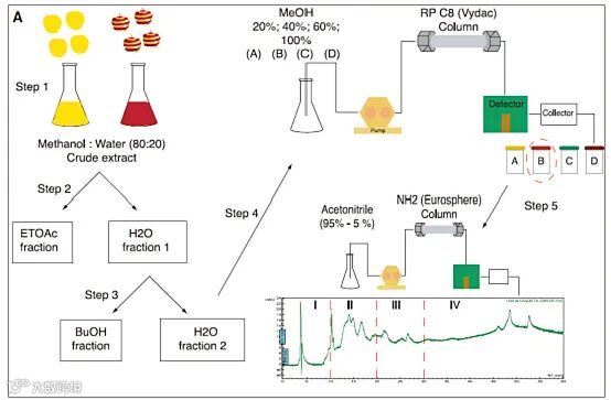 就此来看,这研究不就凉凉了嘛……可是作者并没有放弃,他们分别对苹果皮和苹果肉进行了基于生物活性的提取分离。简单来说就是用体外实验评价提取物的活性,只分离有活性的组分。具体的流程如下图所示。这点分离工作对从事天然药化的同学来说当然是小意思啦~~