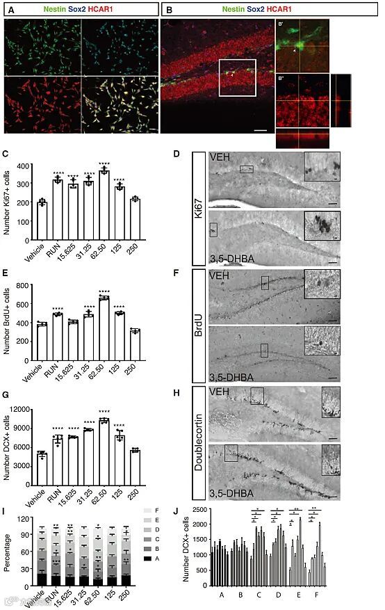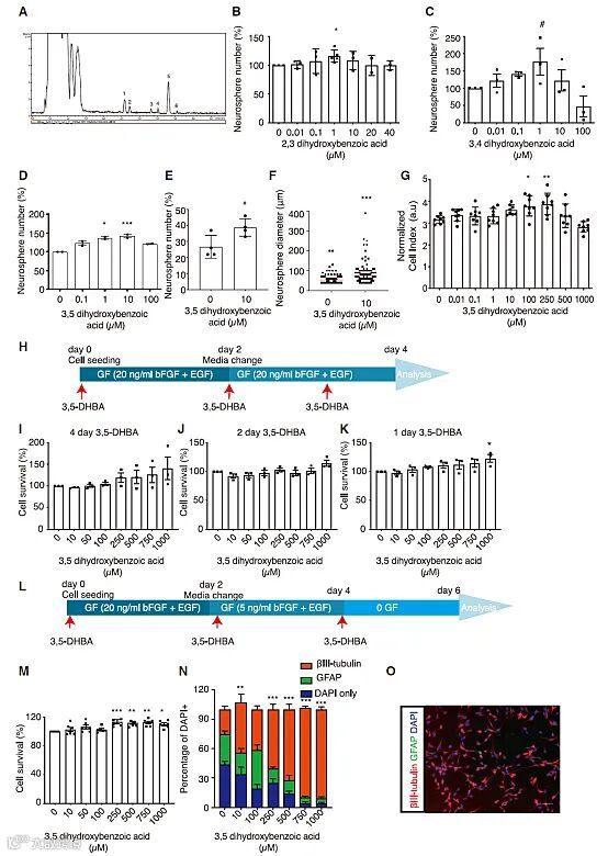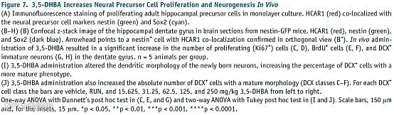 经过反复评价,作者确认组分IV活性明显,但是因为量少而无法进一步分离,随即对其进行了成分分析,找到了二羟基苯甲酸酯葡萄糖苷。随后,作者购买了几种商品化的二羟基苯甲酸(DHBA)考察其是否具有促神经生成作用。无论是体外评价还是体内实验均证明二羟基苯甲酸能够促进神经生成,体内实验中62.5 mg/kg的3,5-DHBA效果最为明显。