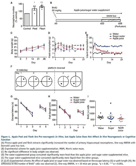作者沿着对槲皮素的研究结果想到了本文的主角——苹果。他们觉得苹果富含黄酮,也是日常消耗量非常大的水果,既然槲皮素具有促神经生成作用,那么苹果会不会也有类似的神奇功效?在体外实验中,他们发现苹果皮和果肉具有促神经生成作用并且作用相似。不过,在体内实验中,戏剧性的一幕发生了——在给予实验动物苹果汁的一个月内,没有观察到苹果汁促进实验动物的神经生成作用。