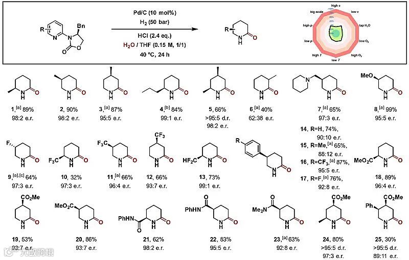 在此基础上,作者详细地研究了反应参数的影响。结果显示像盐酸这样的强Brønsted酸是必不可少的,使用弱Brønsted酸(如甲酸)会形成哌啶产物。此外,作者还测试了不同的溶剂,THF和H2O的混合溶剂效果最好。催化剂的性质对反应结果也是至关重要的。尽管各种Pd催化剂都能以高收率和对映选择性得到所需的δ-内酰胺,但其它催化剂(如PtO2、Ru/C或Rh/C)的收率较低或没有。各种噁唑烷酮都可提供高对映体比率的产物,而苄基取代基可提供最佳结果。将氢气压力降低至25 bar会导致对映体比率降低。