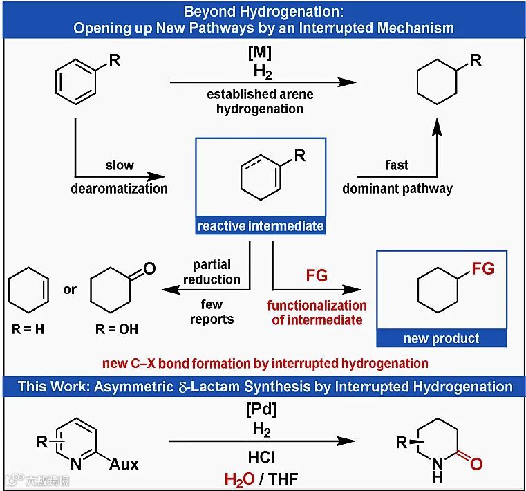 金属催化的氢化反应是一种简单、有效的增加分子复杂性的方法。例如,简单易得的N-杂芳烃(如吡啶)的氢化反应是制备饱和氮杂环的有效方法。但是,目前的加氢策略仅限于构建新的C-H键和N-H键;并且通常需要额外的合成操作以引入其它的官能团。如图1所示,在芳烃的氢化过程中分子氢的逐步加成会产生双键残留的活性中间体,从原则上来讲,后者提供了进一步官能团化的可能性。然而,尽管目前已经实现了某些底物(如苯、苯酚)的部分氢化,但在芳烃氢化过程中利用不饱和中间体来构建C-X键却寥寥无几。