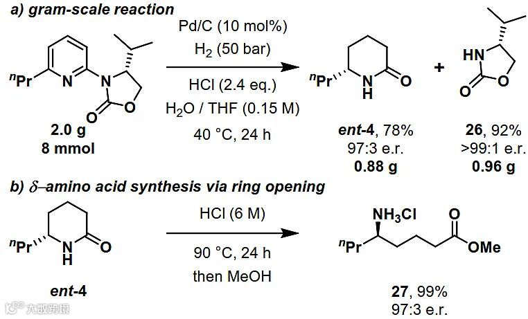 随后,作者研究了该过程的可扩展性以及回收辅基的可能性。如图4a所示,氢化反应能以2 g规模进行,且收率和对映体比例没有明显损失,最终以78%的收率和97:3的对映体比例获得内酰胺ent-4,并以92%的收率和> 99:1 的e.r. 值回收了噁唑烷酮26,从而证实了其良好的可回收性。此外,作者还将δ-内酰胺ent-4在盐酸中加热24 h后用甲醇处理,以99%的收率和97:3 的e.r. 值得到δ-氨基酸甲酯27(图4b)。