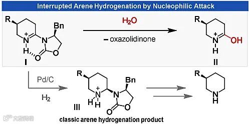 最后,作者还研究了反应机理。为了鉴定潜在的中间体,作者在2h后停止反应,并通过GC-MS检测到保留一个双键的中间体的分子量(图5a)。尽管不饱和中间体在芳烃氢化过程中的寿命很短,并且迅速被进一步氢化,但亚胺28还能以5%的分离产率得到(图5b)。在不存在Pd催化剂和H2的情况下,用盐酸将亚胺28在水/THF中进行处理,几乎定量的转化成δ-内酰胺产物(图5c)。这些结果表明亚胺28是该反应的中间物种,并且可以与水进行亲核取代。值得一提的是,在该反应的六个潜在中间体中,只有亚胺28适合于水解以生成所需的2-哌啶酮。基于这些实验,作者提出了以下可能的反应机理(图5d):在Brønsted酸作用下,噁唑烷酮取代的吡啶上的碱性氮原子被质子化,并通过与噁唑烷酮的氢键作用形成稳定的构象异构体。由于该刚性构象的噁唑烷酮取代基的空间排斥作用,吡啶的无阻碍面的非对映选择性氢化继续进行以建立新的立体中心。在加入两当量的H2后,形成噁唑烷酮取代的亚胺I。与经典的芳烃氢化过程相比,该中间体不会再进行另一次催化还原反应(参见产物III),但会与水发生亲核取代反应,并在取代过程中噁唑烷酮被释放,因此用作可回收的无痕助剂。所得的亚胺鎓II快速互变异构,以产生最终的δ-内酰胺产物。