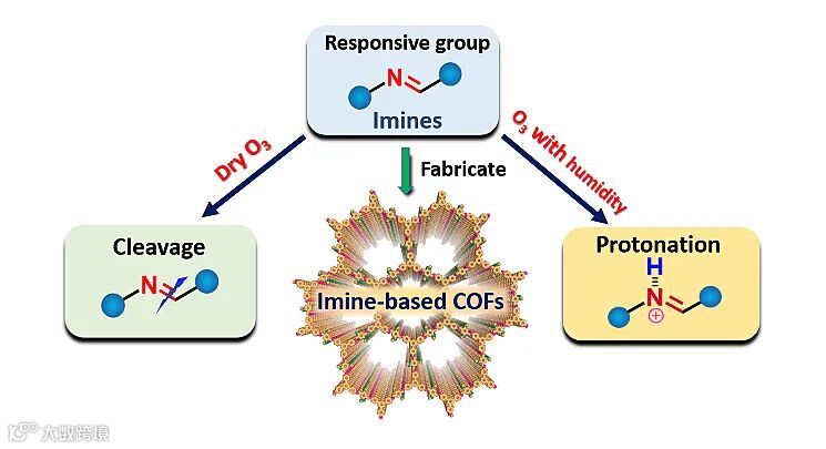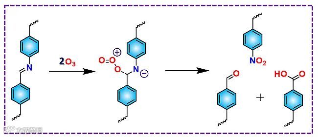,在湿度存在下,臭氧可以通过水分子质子化亚胺键来引发其分解;在干燥情况下,亚胺键可以与臭氧发生氧化反应来分解臭氧。因此,亚胺键可以作为一种理想的响应基团来实现有关臭氧相关的应用(图1)。基于此,