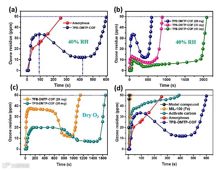 基于以上结论,作者进一步把TPB-DMTP-COF作为固定相用于臭氧的监测和同步去除。作者分别在有湿度存在和干燥情况下对其去除效果进行了研究,发现COF在两种情况下均可高效去除臭氧。在干燥臭氧情况下,COF的去除的效果更佳,这是因为一分子的亚胺基团可以分解两分子的臭氧(图4);而湿度存在下,亚胺的质子化反应只能消耗一分子的臭氧。作为对比,作者合成了无定型聚合物及模型分子来验证COF的规则孔道结构和高孔道率的优势。研究发现COF的臭氧去除效果明显优于无定型聚合物、模型分子、活性炭、MIL-100(图5)。作者通过检测臭氧尾气的浓度,发现COF可以将臭氧浓度从1225 ppm降低到0.08 ppm,达到了OSHA对臭氧浓度的要求。此外,作者还进行了COFs材料通用性的研究,发现多种亚胺COFs均可用于臭氧相关的应用,亚胺COFs的效果要明显优于其他键连接(如酸酐、硼酸酯)的COFs材料。