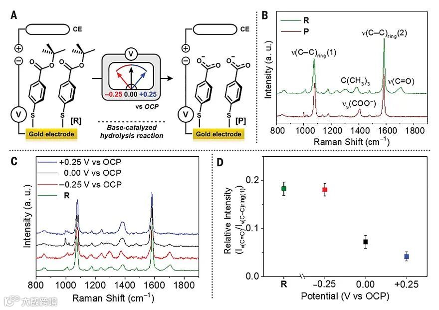 为了验证该方法的可行性,作者探究了电诱导效应对碱催化的苯甲酸酯皂化反应的速率影响。鉴于苯甲酸甲酯和苯甲酸乙酯皂化反应的效果较差,因此作者选择空间位阻较大的4-巯基苯甲酸叔丁酯(TBMB),并通过表面增强拉曼散射光谱(SERS)来监测皂化反应的进程。如果电诱导效应很强,那么在施加正电压时就会加速TBMB的皂化反应以生成4-巯基苯甲酸根;而施加负电压时反应则进行得很慢(图2A)。如图2D所示,在反应未开始时,C=O键伸缩振动[v(C=O)=1706 cm-1]峰强度与芳环C-C键振动[v(C-C)ring(1)=~1070 cm-1 ]峰强度的比值(Iv(C=O)/Iv(C-C)ring(1))为0.183;当未施加电压(即OCP)时,[v(C=O)]峰强度大大减小(图2C),峰强度比值为0.072,这表明电极表面上的酯已经被大量消耗;当在+0.25 V下反应22.5 h时,[v(C=O)]峰强度急剧降低,这表明该电压能够显著地提高皂化反应的速率;相比之下,在-0.25 V下进行的反应则几乎被完全抑制,此时的峰强度比值为0.181,与未开始反应的比值(0.183)十分接近。这些结果表明皂化反应进行的程度可以通过施加电压来控制。