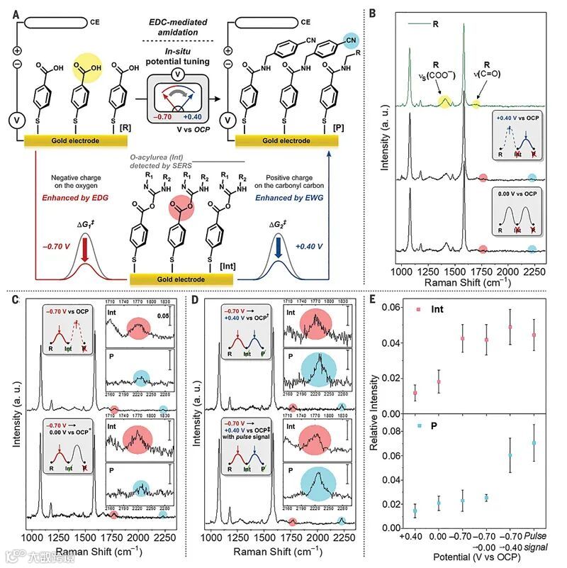 最后,作者探究了两步法羧酸酰胺化反应(图4)。首先,羧酸(如苯甲酸)进攻1-乙基-3-(3-二甲基氨基丙基)碳二亚胺(EDC)上的碳二亚胺碳,得到O-酰基脲。如果增强羧酸的氧亲核性,就能加快第一步反应的进行。其次,O-酰基脲中的羰基碳可作为亲电试剂与胺反应,得到所需的酰胺化产物。类似地,如果增强羰基碳的亲电性,就会加快第二步反应的进行。事实上,当未施加电压(即OCP)时,反应不会进行(图4B);当施加正电压(+0.40 V)1 h后,反应仍不会进行;而施加负电压(-0.70 V)反应1 h后,SERS光谱在1772 cm-1处出现了一个新的峰(图4C),这归因于O-酰基脲的羰基伸缩振动。当施加负电压(-0.70 V)反应40 min后,切换至未施加电压(即OCP)继续反应20 min,发现在2228 cm-1处有一个微小的峰(即C≡N键的伸缩振动),这暗示着两步法羧酸酰胺化反应已发生。接着,施加负电压(-0.70 V)反应40 min,然后切换至正电压(+0.40 V)继续反应20 min,结果显示2228 cm-1处的峰强度显著增加(图4D),这表明正电压加速了第二步反应的进行。最后,作者测试了脉冲模式,即施加负电压(-0.70 V)反应3 min,然后施加正电压(+0.40 V)反应3 min,并在1 h内重复10次,结果显示羰基峰和氰基峰均清晰可见(图4D)。此外,图4E显示了不同电压下两个信号的相对强度,这表明施加负电压促进了第一步反应的进行,施加正电压则促进了第二步反应的进行,从而证实了该方法能够对分子的电性进行连续的调节。