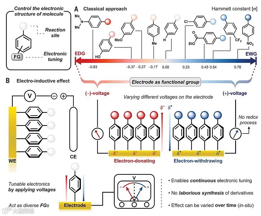 对于广大有机化学工作者而言,官能团再熟悉不过了,它是决定有机化合物化学性质的原子或原子团(如羟基、羰基、卤素、疏基、氰基等)。今天,笔者要给大家介绍一个“另类”的官能团——电极。电极不是用于电化学的吗?怎么就成了官能团呢?这还得从1937年说起,Hammett当时首次提出了Hammett方程,描述了反应物官能团如何影响反应速率,这一工作也引出了化学中的一个重要概念——官能团对分子电子性质的诱导效应。这一概念在化学中有着极为广泛的应用,化学家可以通过修饰不同的官能团来根据需要加快或减慢反应,但实际上这种调节分子性质的方法既不高效也不方便。这是因为每个官能团只能产生其特有的诱导效应,无法连续调控分子的性质,因此必须制备各种各样官能化的衍生物,这不仅费时费力,还存在一定的局限性,因为并非所有的分子都简单易合成。