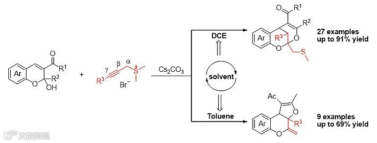 黄有教授课题组在先期发展的硫叶立德连续环化反应的基础上,2020年利用炔丙基锍盐与2-羟基色烯反应,通过对溶剂的改变,分别实现了[4+2]/[4+2]和[4+2]/[4+1] Domino连续环化反应,从而高效合成含硫苯并双氧杂桥环与二氢呋喃色烯化合物,发展了炔丙基锍盐的γ位参与构筑碳碳键的首例报道,进一步拓展了硫叶立德的新型反应模式(图9)(