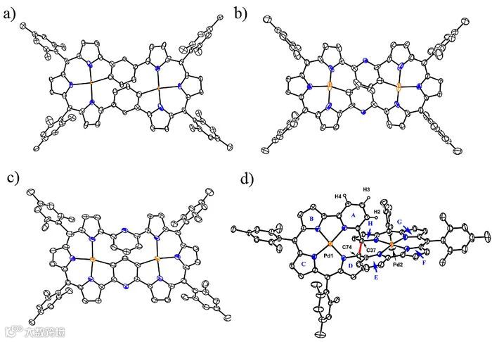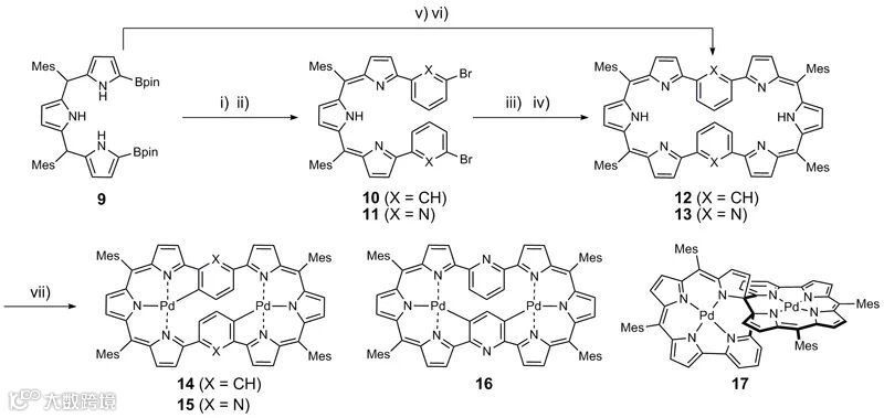 基于前期的工作(Angew. Chem. Int. Ed., 2016, 55, 6438; Chem. Commun., 2019, 55, 11454),近日,该课题组以三吡咯烷-α,α'-二(频哪醇硼酸酯)(9)及间二溴苯/2,6-二溴吡啶为原料,利用Suzuki偶联的方法合成了苯掺杂、吡啶掺杂的八元扩环卟啉化合物(12/13)。12与醋酸钯作用只形成一种双侧插Pd产物14,而13可以与醋酸钯作用,同时得到了双侧插钯产物15、单侧插钯产物16和螺环化合物17。15与16在三氟醋酸的作用下能够相互转化。研究表明,吡啶杂环的引入,丰富了八元扩环卟啉类金属配位结构的多样性与可调控性,为新型分子开关的设计提供了新的思路。