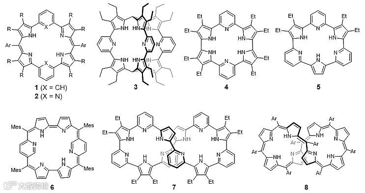 扩环卟啉是一类由吡咯及类似杂环直接或通过个数不等的桥原子连接而成的、内部至少具有17原子路径的一类大环化合物。扩环卟啉由于其独特的光学、电学及与金属配位的性质受到了科学家的广泛关注。在扩环卟啉家族中,含有吡啶单元的分子继承了吡啶单元所特有的碱性及配位活性,因而在分子识别、质子诱导的构象翻转等方面被深入研究。