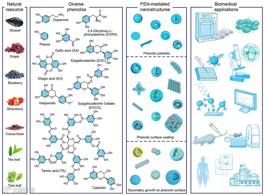 近期,来自浙江大学/浙江中医药大学的Zhong Chen教授、美国加州大学伯克利分校Phillip B. Messersmith教授以及美国加州大学圣地亚哥分校的Jesse V. Jokerst教授合作,聚焦于生物医学领域,系统性地综述了基于酚类化合物的纳米技术 (Phenolic-enabled nanotechnology, PEN) 在该方向上的研究进展。