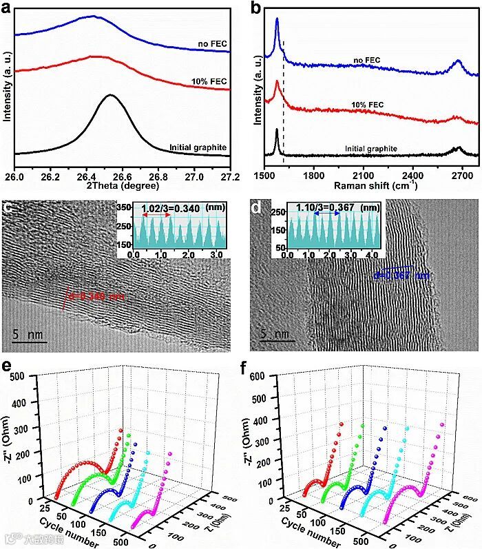 考察了循环500次后石墨正极的结构,通过XRD、Raman和HRTEM表征表明电解质中FEC的引入缓解了石墨层剥离,维持了长循环后石墨正极的结构稳定性。不同循环次数后的EIS进一步说明FEC的引入有利于提高Na/石墨双离子电池体系的稳定性。