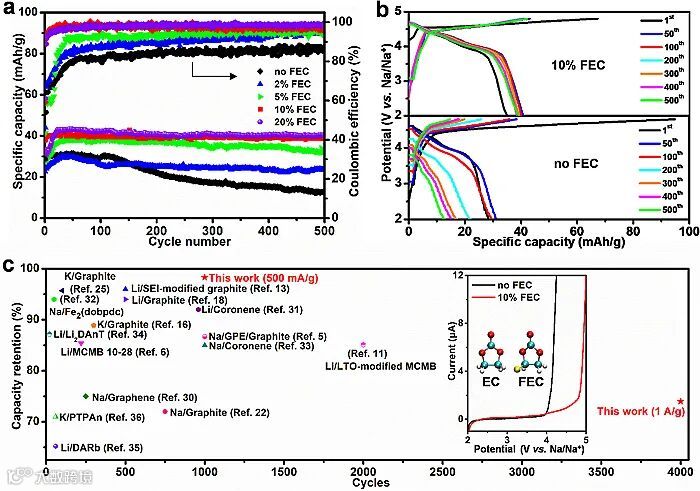 图1. 不同FEC含量的电解质对钠/石墨双离子电池性能的影响