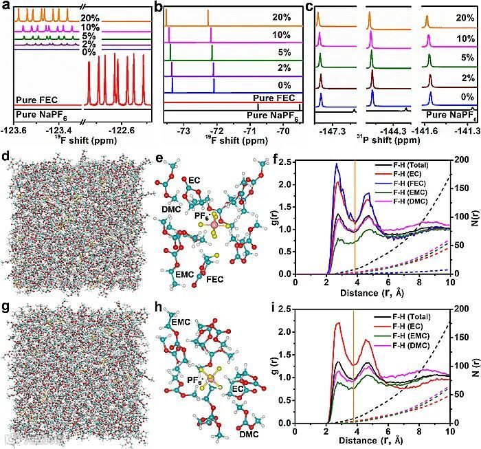 考察了添加不同FEC含量的电解质的NMR、Raman、FTIR光谱,结合分子动力学模拟,发现电解质中PF6ˉ阴离子与FEC缔合,降低了溶剂化结构中其他碳酸酯类溶剂的分子数目,将电解质的电化学窗口提高了0.7 V。同时,FEC也成为了Na+阳离子溶剂化层的组成之一。