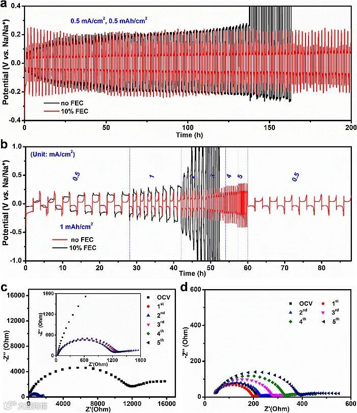 组装了基于不同FEC含量的电解质的钠金属对称电池,结合循环后的电化学阻抗谱(EIS)、XPS表征,证实FEC的引入促进了钠金属表面富含NaF稳定界面膜的形成,有效抑制了钠金属与电解质的副反应。