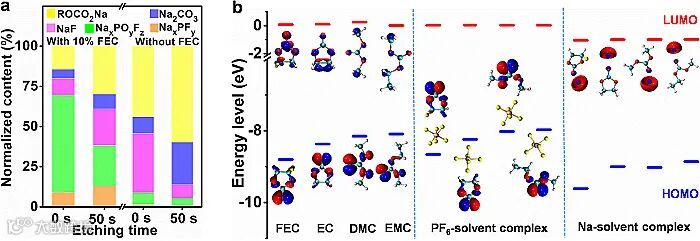 基于不同FEC含量的电解质,对循环500次的石墨正极进行了XPS深度刻蚀,通过组成结构分析发现FEC的引入促进了富氟界面膜的形成,有效抑制了石墨的体积变化。然而,当电解质中不含FEC时,随着刻蚀深度的增加,ROCO2Na和Na2CO3含量显著增加,说明电解质中的溶剂发生了严重的氧化分解。考虑溶剂化作用的影响,阴/阳离子-溶剂分子缔合物的HOMO-LUMO能级大小进一步佐证了富氟界面层的形成机制。