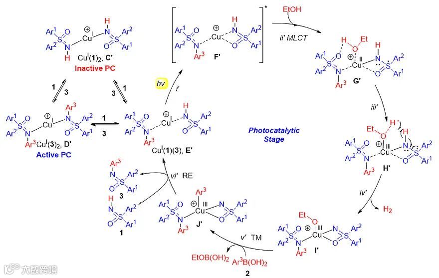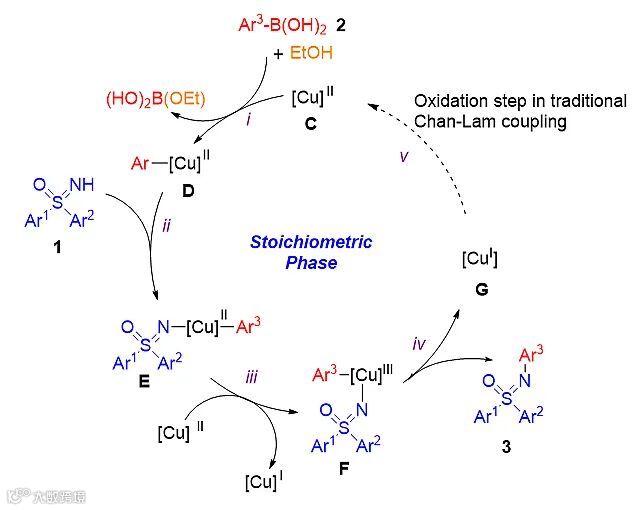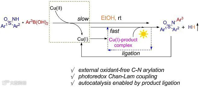 贾铁争课题组与Kozlowski课题组合作报道了一种光氧化还原铜催化的二芳基砜亚胺和芳基硼酸的脱氢Chan-Lam偶联,具有良好的官能团兼容性。机理研究还揭示了一种独特的自催化过程,即N-芳基砜亚胺与铜的配合中间体能够在没有氧化剂存在下,利用可见光激发的MLCT过程,有效促进C-N的脱氢偶联反应。该研究有助于理解自催化的特性和独特的配体促进铜的光致激发现象。该方法作为一种可用于补充经典的氧化C-N偶联反应的合成策略,具有广阔底物普适性且避免了因氧化脱硼化等副产物的生成。该研究提出的无需消耗氧化剂的光氧化还原Chan-Lam偶联的概念,为其他体系下构建C-N键提供了一定基础。