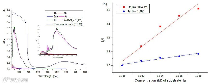 随后作者又对反应机理进行了光谱研究,1a、2a、3aa和Cu(NCCH3)4PF6在245 nm附近没有明显吸收,而合成的配合物[Cu(N(H)OSPh2)2][PF6] (A’) 与[Cu(N(Ph)OSPh2)2][PF6] (B’)在近可见光区则有较强的吸收(下图左),其发射和激发光谱在近紫外区有很强的激发。随后的Stern-Volmer实验表明只有1a可以显著淬灭激发态的Cu(I)配合物B’,而A’和铜盐Cu(NCCH3)4PF6则没有被淬灭(下图右)。