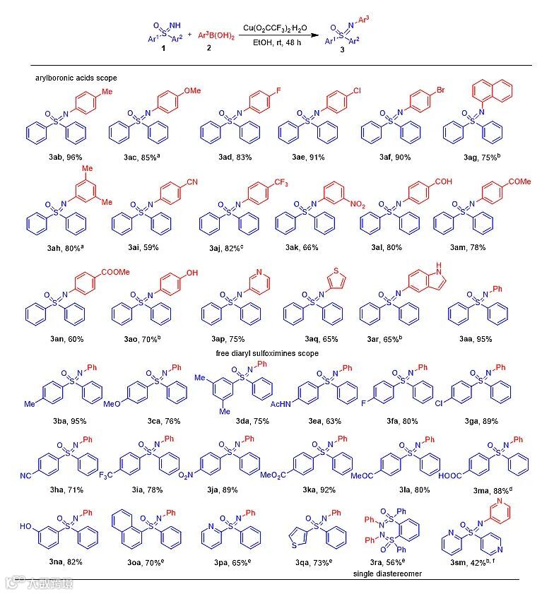 近日,南方科技大学的贾铁争课题组和宾夕法尼亚大学的Kozlowski教授课题组联合报道了一例光氧化还原铜催化条件下的自催化Cham-Lam偶联反应。该工作利用二芳基砜亚胺与芳基硼酸为底物,在无外加氧化剂、室温条件下就能以高产率得到一系列N-芳基化的二芳基砜亚胺产物并放出氢气。该成果近期发表在Nature Communications 上,文章的共同第一作者为南科大博士研究生王聪和博士后张辉(实验部分)以及宾大化学系博士研究生Lucille Wells(理论计算部分),同时南科大博士研究生孟庭庭,南科大-西北大学交换硕士生刘甜,西北大学药物工程系刘庆超教授,以及宾大化学系Patrick Walsh教授都对该工作做出了重要贡献。