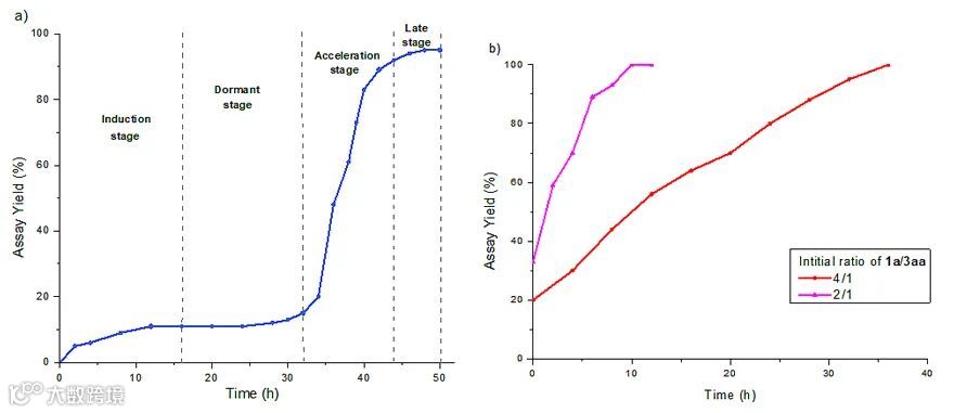 在对反应速率进行追踪研究时,作者意外地发现该反应产物的生成速率和时间的关系并不是常规的线性关系(下图)。而是存在“诱导期”、“蛰伏期”和“加速期”三个阶段。由于砜亚胺类化合物作为金属催化剂的配体也有过报道,因此作者推测芳基化产物可能作为配体与铜催化剂配位,成为加速反应的真正催化活性物种。为验证自催化的机理,作者在反应初始条件下,加入一定量的催化产物,成功观察到该反应的潜伏期消失,转化速率明显上升。