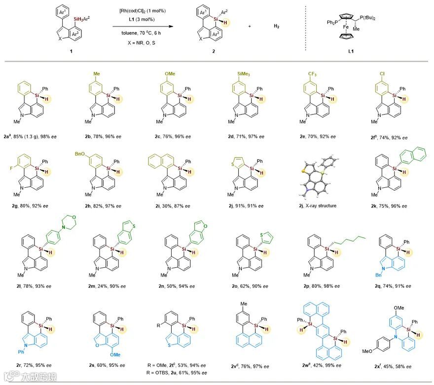 接下来,在最优反应条件下,作者考察了二氢硅烷底物的适用范围(图2)。结果表明,该方法对吲哚联芳烃上有给电子(2b-2d,2h)、缺电子(2e-2g)、含杂环(2m-2o,2j)和烷基(2p)的底物都有很好的兼容性,均能得到了良好的收率(24-91%)和优异的对映选择性产物(90-98% ee)。此外,该体系也能兼容苯并呋喃(2s)和苯并噻吩(2t-2u)联芳烃,得到中等收率(53-61%)和优秀的对映选择性产物(94-95% ee)。值得一提的是,该方法也能成功实现极优对映选择性的双硅桥π-共轭体系的硅中心手性联芳烃的催化不对称合成(2w)。