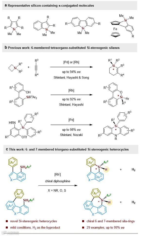 硅桥接的π-共轭联芳烃骨架作为新兴的光电材料的关键组件已经广泛应用于有机发光材料、薄膜晶体管、荧光传感器、有机太阳能电池中。过去几十年来,经过有机化学家的不断努力,合成了许多硅桥接的五元环联芳烃骨架,如噻咯、苯并噻咯、9-硅芴、苯并二茂铁噻咯等(图1a)。然而,含硅的六元和七元环联芳烃骨架却鲜有报道,其中具有硅中心手性的例子更是屈指可数。目前,仅有Shintani、Hayashi、Nozaki和宋振雷课题组报道了四取代的六元环硅中心手性硅烷的合成(图1b)。不对称催化三取代的六元或者更大环的硅中心手性一氢硅烷到目前为止还没人报道。鉴于日益增长的功能材料导向的硅桥接联芳烃合成需要,构建硅中心手性的一氢硅烷引起了化学工作者的关注。因为这些手性一氢硅烷可以进行各种各样立体专一的转化,从而有望在手性功能材料领域得到进一步的发展和应用。