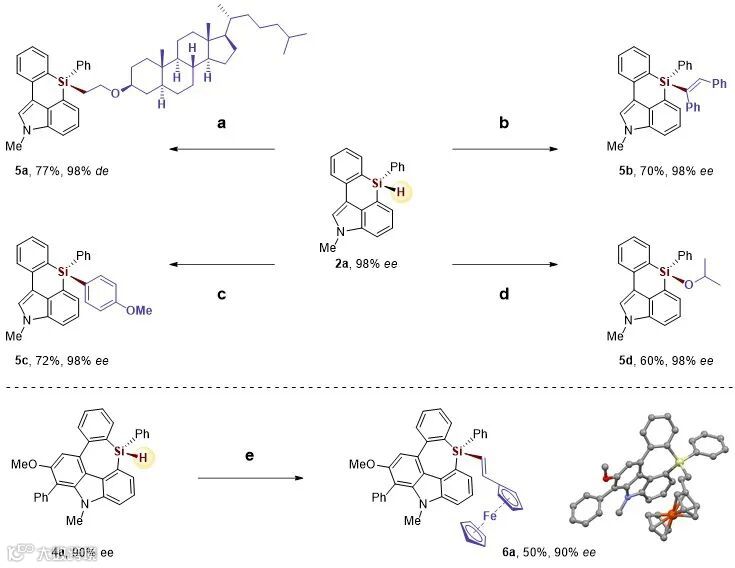 为了探索六元和七元环的硅一氢杂环在合成方面的应用,作者进一步对产物进行了一系列的转化反应研究(图4)。结果显示,六元一氢硅烷产物2a在[Rh(cod)Cl]2、Pt(dvds)或者Pd(t-Bu3P)2催化下,能与烯基醚、内炔、芳基碘苯或者丙酮反应,得到新的对映选择性保持的四取代硅中心手性杂环产物(5a-5d,98% ee)。同时,七元环产物4a和二茂铁乙烯反应,能得到中等收率以及对映选择性保持的氧化烯基化反应的产物6a(50%,90% ee),其绝对构型也得到了X射线单晶衍射的确定。
