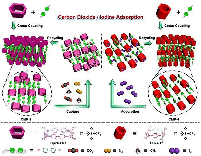 通过对两种大环芳烃单晶结构的分析,作者发现它们都呈现高度倾斜的构象,每个大环所包含的多个结合位点也决定了在构筑CMP材料时,它们会采取特殊的穿插交联共轭的方式,这使得四种材料都能够对碘蒸气进行有效吸附。其中以LT6-OTf为单元和对二乙炔基联苯构筑的CMP-4材料对碘的吸附性能最好,1克CMP-4可以吸附约2.1克碘蒸气,而且它对水溶液中碘的去除效率也高达94%。此外,以BpP6-OTf为单元和对二乙炔基联苯构筑的CMP-2能够在常温下吸附二氧化碳且不吸附任何氮气,从而实现对二氧化碳的高度选择性吸附。该工作将新型超分子大环与多孔聚合物的优势相结合,开拓了共轭大环聚合物在气体吸附领域的优秀性能,推动了基于大环芳烃的新型共轭大环聚合物的合成和发展,为多孔材料的设计和应用开辟了新的道路。