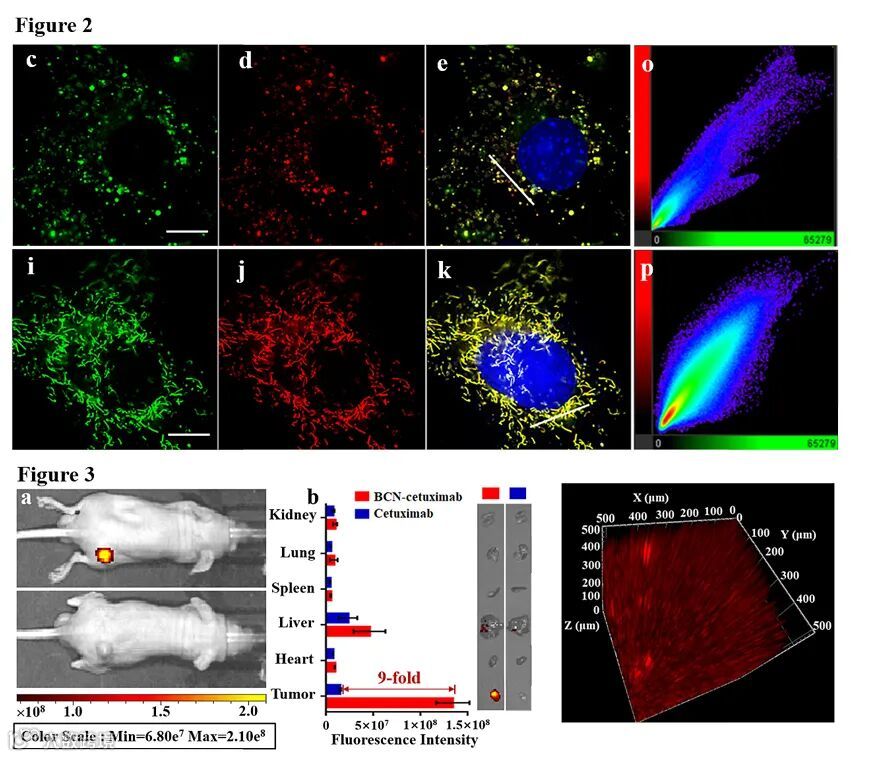 这类探针在生命环境中有较高的化学稳定性,对酸碱不敏感,且光学稳定性优于一些商品化探针。吴昊星课题组利用该探针成功地实现了对亚细胞结构的选择性标记(皮尔森系数:0.94–0.95),具有优异的信噪比(14–111倍)。同时实现了此类荧光探针对小鼠移植瘤的免疫预定荧光成像,这类荧光成像方法的实施有助于避免传统免疫荧光成像所用探针长时间生物循环造成的降解,从而提高活体水平的靶标检测灵敏度。