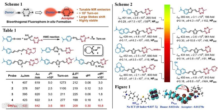 近日,四川大学华西医院吴昊星课题组通过新的设计策略构建了新型荧光体系,该体系为电子供体–π–受体(D–π–A)四嗪染料体系,并利用四嗪生物正交反应调控激发态分子内电荷转移(ICT)过程。首先,该团队以苯胺为电子供体,四嗪为电子受体,利用课题组前期报道的方法(Angew. Chem. Int. Ed., 2019, 58, 1106 –1109)合成了包括多种不同π-共轭体系的四嗪探针(Scheme 1)。由于四嗪极度的缺电子特点(低能量的LUMO轨道),使得四嗪染料的荧光完全淬灭。与亲二烯体如环辛炔(BCN)发生生物正交反应后,电子受体由四嗪转变为哒嗪,获得了具有ICT效应的荧光产物,实现荧光从“无”到“有”的变化。其中,以π桥噻吩组成的四嗪染料HF642能够实现961倍的荧光增强,同时具有量子产率高和Stokes位移大等优异光学特征。因此,该课题组将这种具有四嗪-噻吩-电子供体的荧光骨架体系命名为Huaxi-Fluors(HFs)。