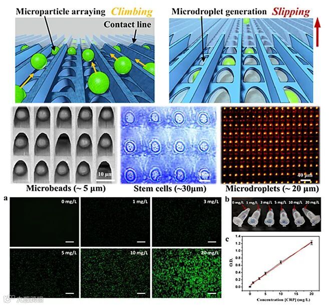 该论文受自然界中猪笼草瓶口特殊三维楔形结构的启发,创新性地将三维倾斜微阵列表面用于高通量液滴、细胞和颗粒的分散阵列化。论文描述了该3D仿生猪笼草瓶口表面(Nepenthes Peristome Surfaces, NPS)在滑动模式下,借助曲率诱导的拉普拉斯压力,实现了超快微滴生成;以及在爬升模式下,利用蒸发驱动的马朗戈尼效应,实现了高密度微颗粒的聚集与排列。通过调节接触角和倾斜角,观察到了液滴由于接触线各向异性的运动与钉扎,在NPS上表现出不同的润湿现象,且由于不同条件下的膜厚梯度,最终导致微液滴的产生和微颗粒的阵列效果具有显著的差异。在爬升模式下,自发形成的有厚度和温度梯度的水膜,导致水分蒸发增强,微粒向后退的接触线聚集。当微粒子在马朗戈尼流(热毛细效应)驱动下到达后退的接触线时,由曲率诱导的拉普拉斯压力引起的不稳定薄膜将微粒子推入微腔内。在滑移模式下,液体扩散迅速,在后退接触线附近的不稳定的液体薄膜会分裂成均匀的微滴。在具有亲水性的微腔中,液滴被牢牢地锁住,此时微液滴蒸发速度较慢。在没有机械泵的情况下,基于微孔阵列的不同应用也得以实现,如免疫分析的高覆盖率微粒子阵列、干细胞阵列以及快速的液滴生成。在实验室经过初步优化,NPS可在65 s内排列粒径为5微米,覆盖率为85%的40万个微珠;可在3 s内排列直径约20微米,覆盖率为100%的成千上万的微滴。并且,作者进行了dELISA的概念演示,获得了各种浓度下良好阵列的免疫复合物微珠阵列,验证了C型反应性蛋白(CRP)的计算浓度与常规ELISA测定的良好一致性。这种精心设计的仿生表面表现出了优异、便捷的高通量阵列性能,并作为一种超快、通用、直接在水溶液中捕获和阵列单细胞的方法,可广泛应用于各种物理、生物和化学分析,特别是可视化的高通量阵列分析。
