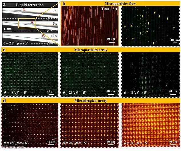 图2. (a)当接触角接近极限值时,接触线在蒸发作用下开始回缩。(b)浅层区域中流动的微粒快照(时间= 5秒)以及暗场放大图。(c)当倾斜角为 -5°时,微粒子阵列密度由于接触角不同而变化。(d)在倾斜角为 +5°时,微液滴阵列大小由于接触角不同而变化。