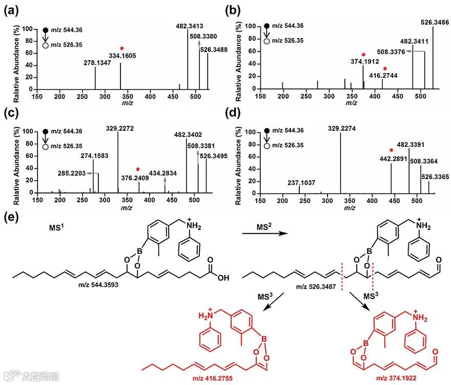 图2. 质荷比526.35 (544.36-526.35) 碎片离子的三级质谱图: (a) 2-methyl-4-PAMBA标记的 5, 6-DHET的三级谱图; (b) 2-methyl-4-PAMBA 标记的 8, 9-DHET的三级谱图 8, 9-DHET; (c) 2-methyl-4-PAMBA 标记的 11, 12-DHET的三级谱图; (d) 2-methyl-4-PAMBA 标记的 14, 15-DHET的三级谱图; 红色星号标记的碎片离子都由硼酸酯α-C裂解产生; (e) 2-methyl-4-PAMBA标记的8, 9-DHET硼酸酯α-C裂解可能的路径