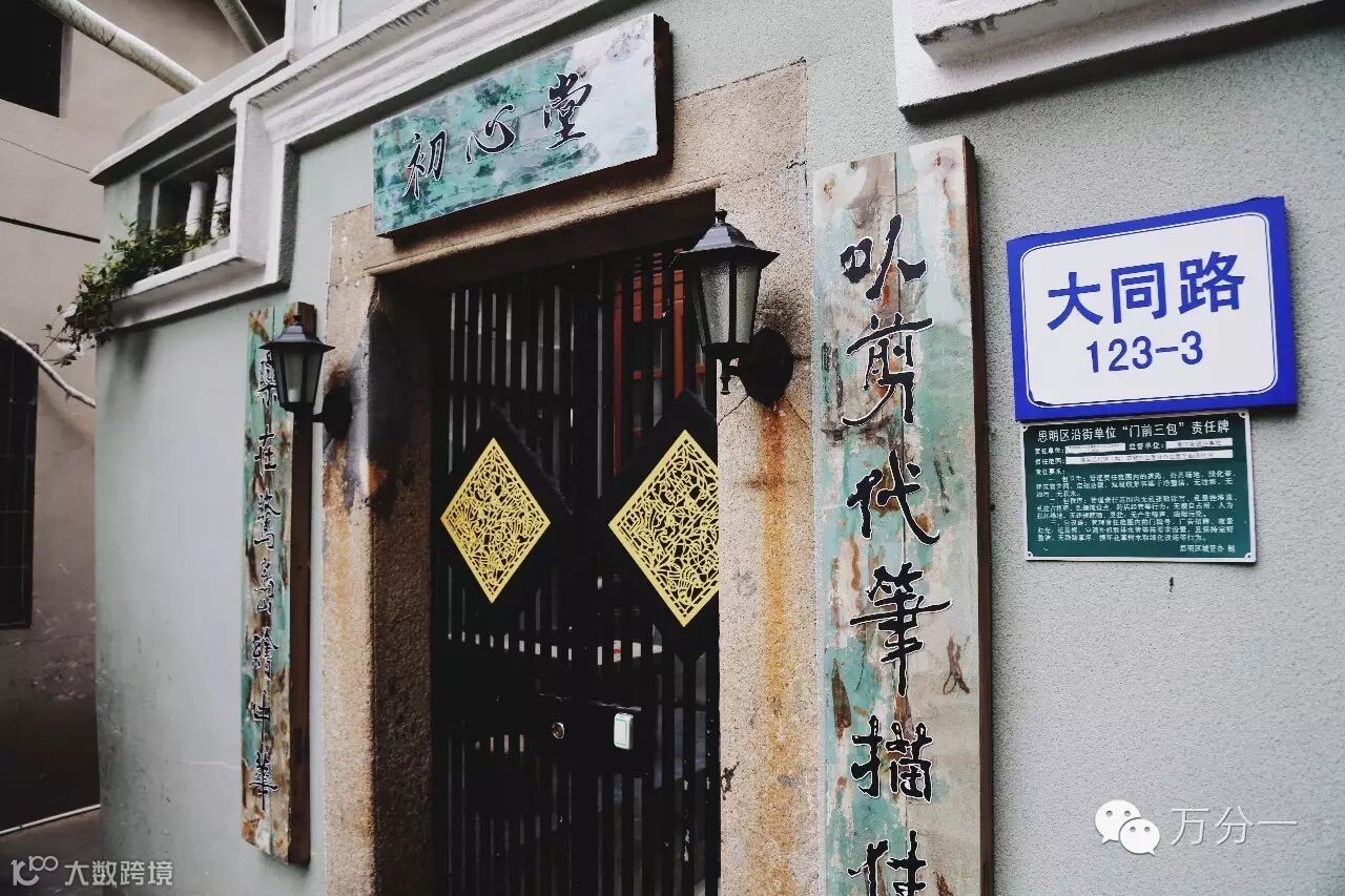 穿过仅容一人通过的昏暗巷弄,七级台阶上就是鹭江老剧场公园,台阶右侧一栋细窄的瘦楼。