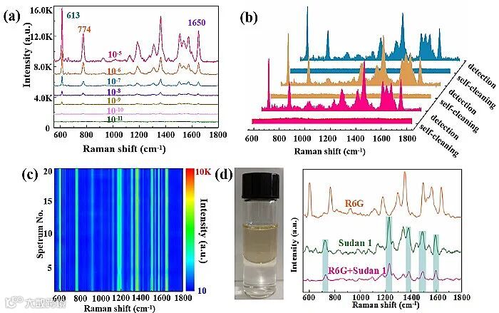 实验表明,利用该结构作为SERS检测基底,在酒精溶液中,可以实现对痕量(< 10-11 M)罗丹明6G分子的快速检测。同时,分子特征峰强度与分子浓度在一定范围(10-5 M-10-11 M)内保持较高的线性关系,为液相环境下的定量分析提供了可能。而且其优秀的均匀性为实际应用提供了保障。该腔体结构在金纳米颗粒的支持下具有杰出的疏水效果,实现了油水混合溶液中的定向检测,表现了其在污水检测中的极大潜力。此外,由于其高效的光利用率和快速的电子转移速率,该基底可实现染料分子的光催化降解,具有良好的自清洁能力和重复利用的潜力。该工作的完成在生物化学领域具有极大的传感和监测潜力,为SERS基底的应用提供了新方式。