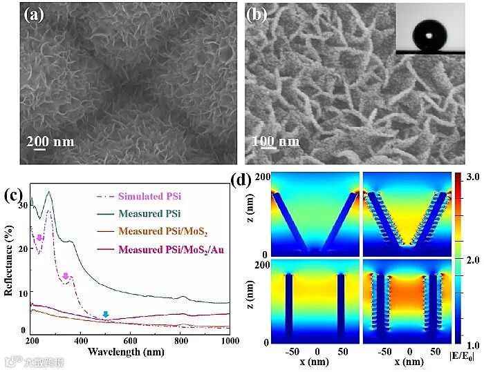 图1. (a)金字塔硅/二硫化钼的微观形貌,(b)金字塔硅/二硫化钼/金纳米颗粒的微观形貌,(c)不同基底的反射谱,(d) 不同纳米腔体的局域电场分布。